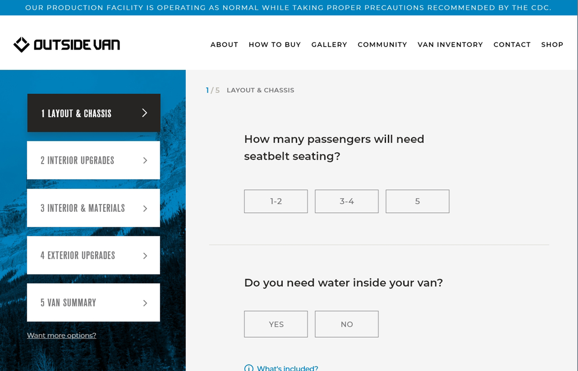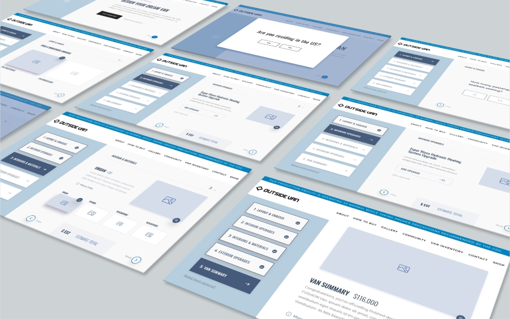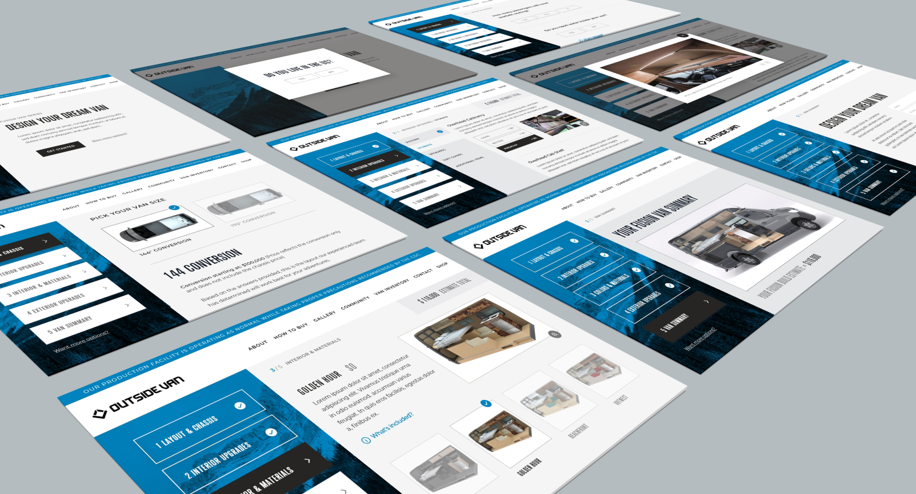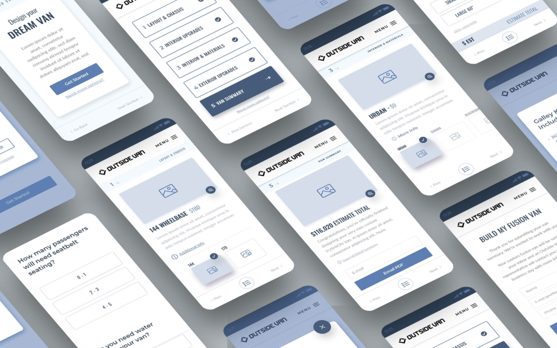 A complex solution finder was developed for new customers to determine what features and necessities they required before buying a van. This allowed a simple direct mechanism to cover all features and options provided by the Outside Van company starting a dialog with the customer. The Solution Finder style was developed to fit with the company’s pre-existing brand identity and web presence.