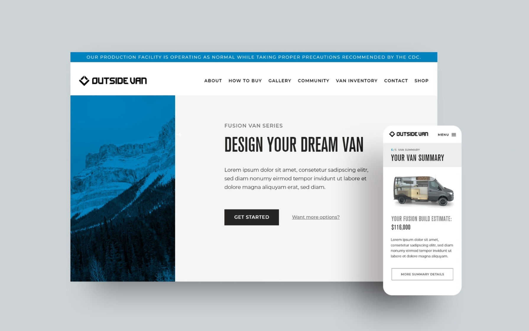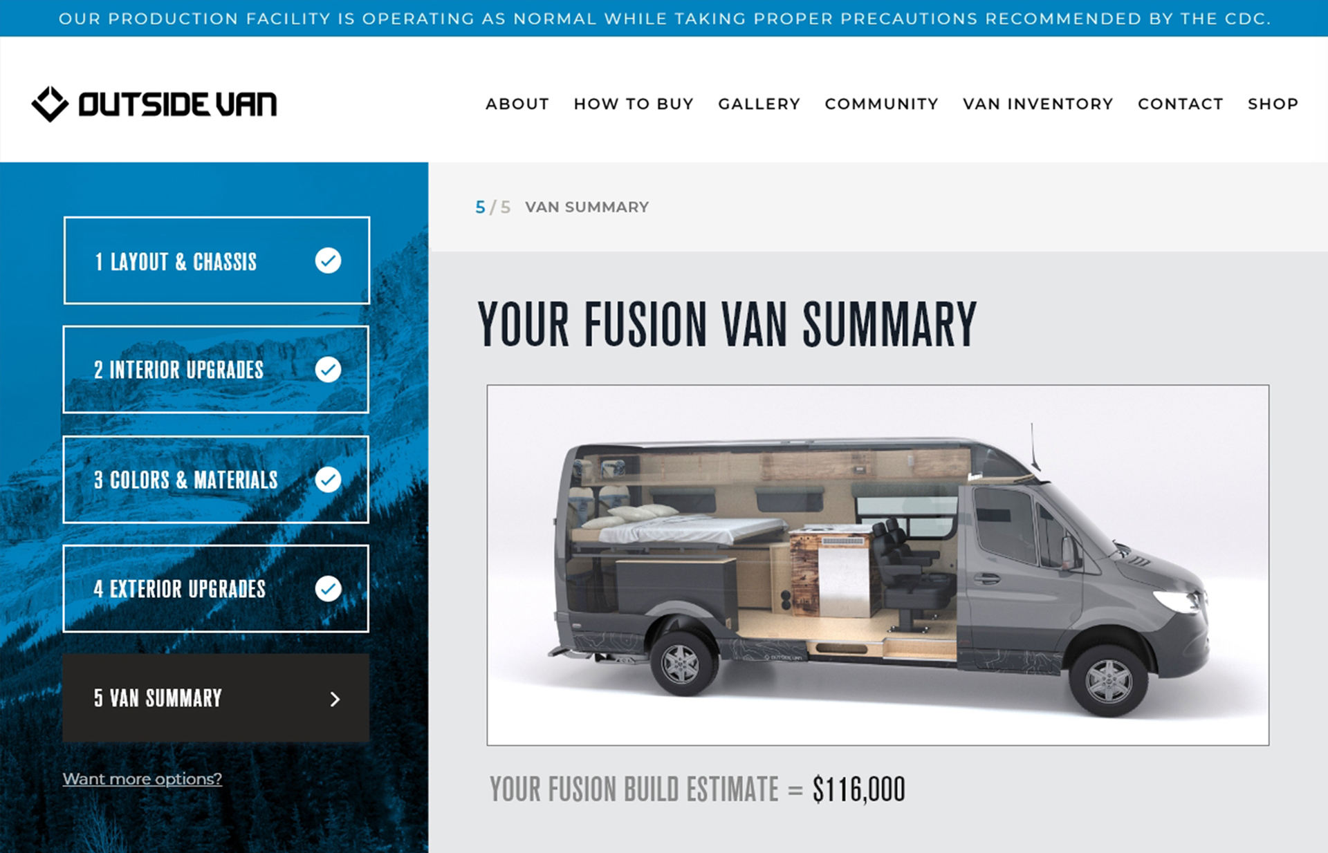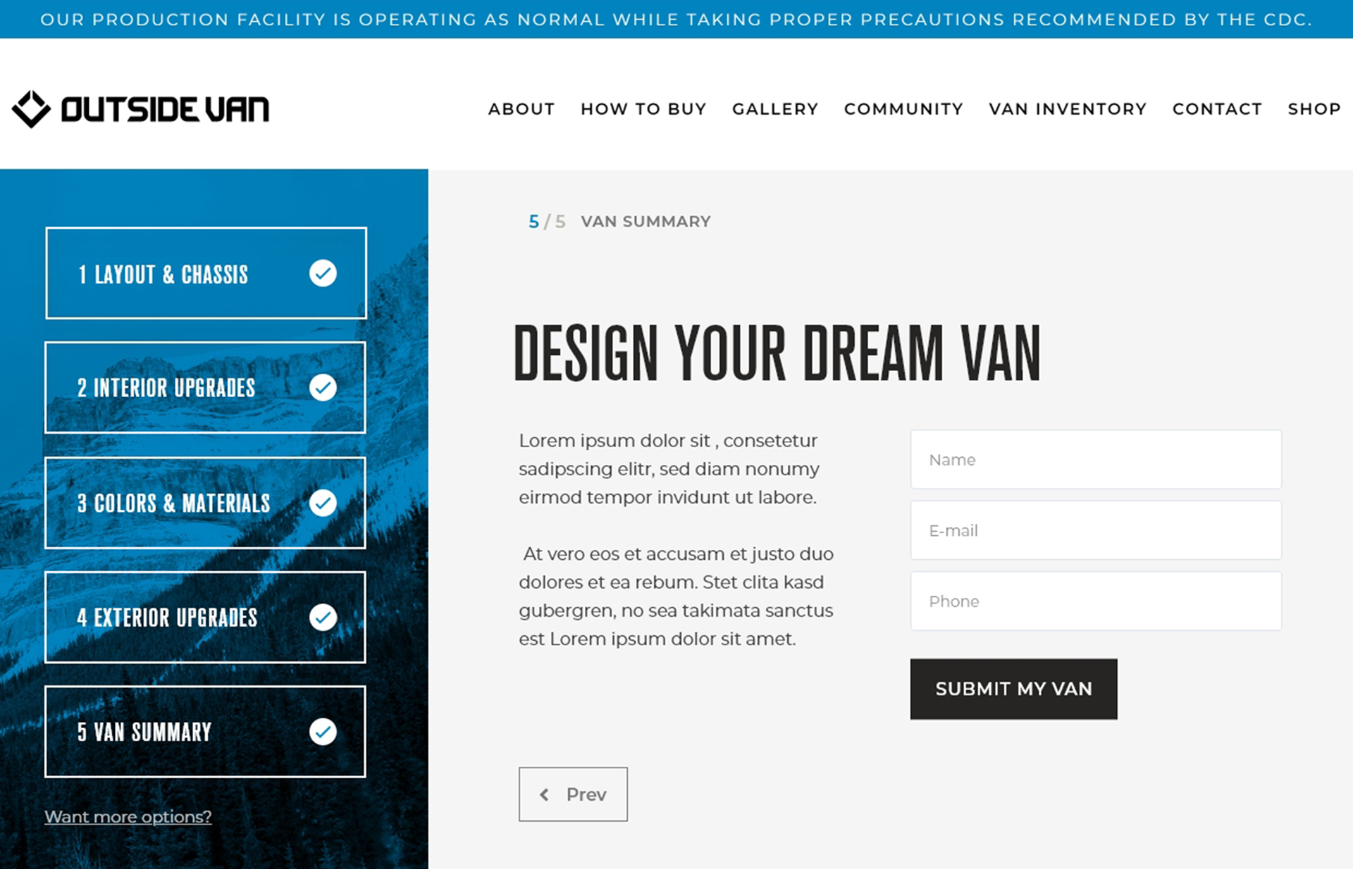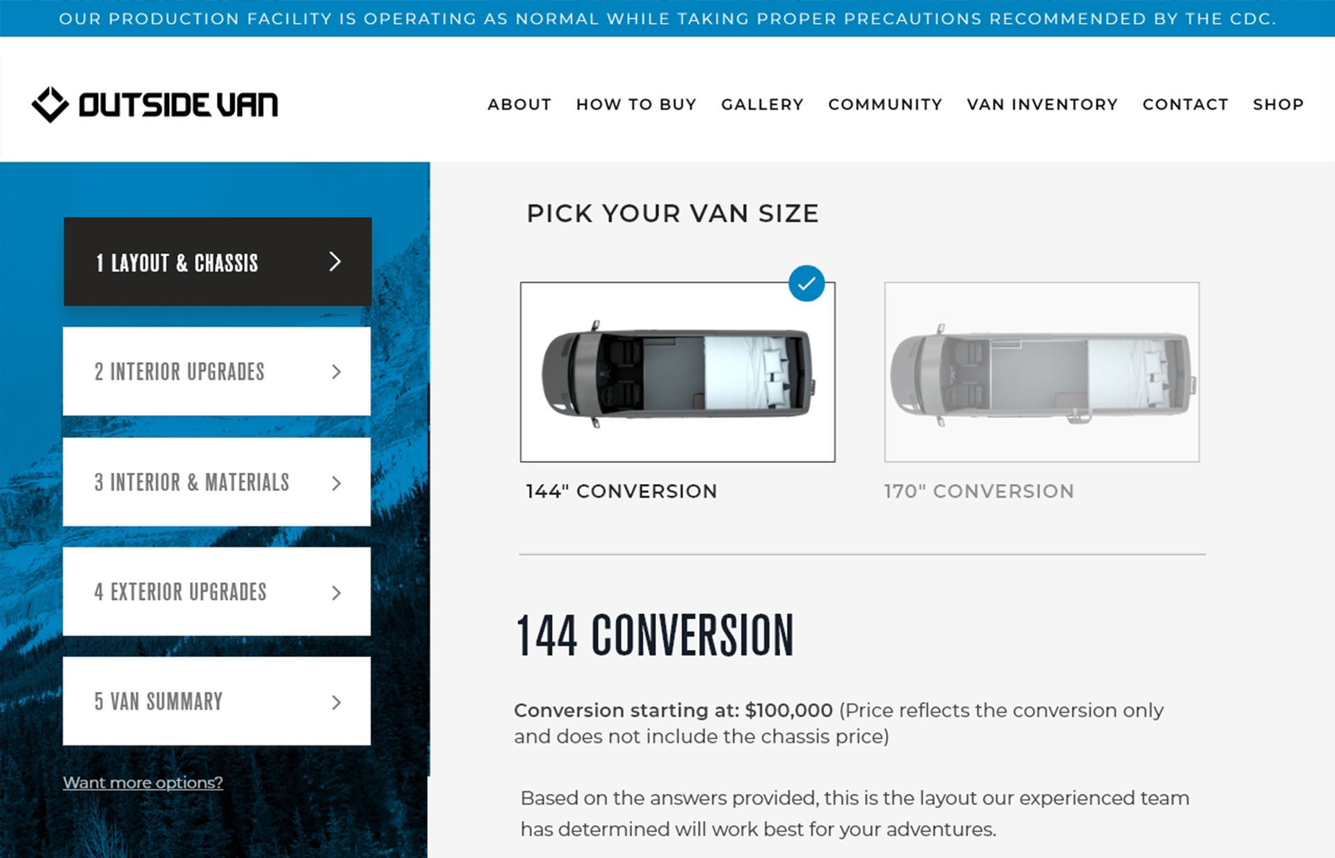 A complex solution finder was developed for new customers to determine what features and necessities they required before buying a van. This allowed a simple direct mechanism to cover all features and options provided by the Outside Van company starting a dialog with the customer. The Solution Finder style was developed to fit with the company’s pre-existing brand identity and web presence.