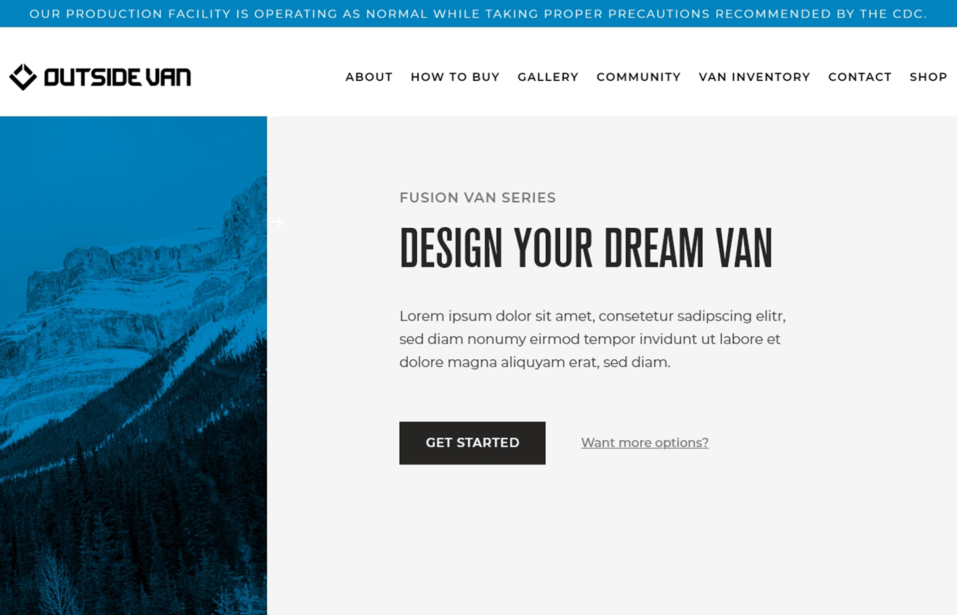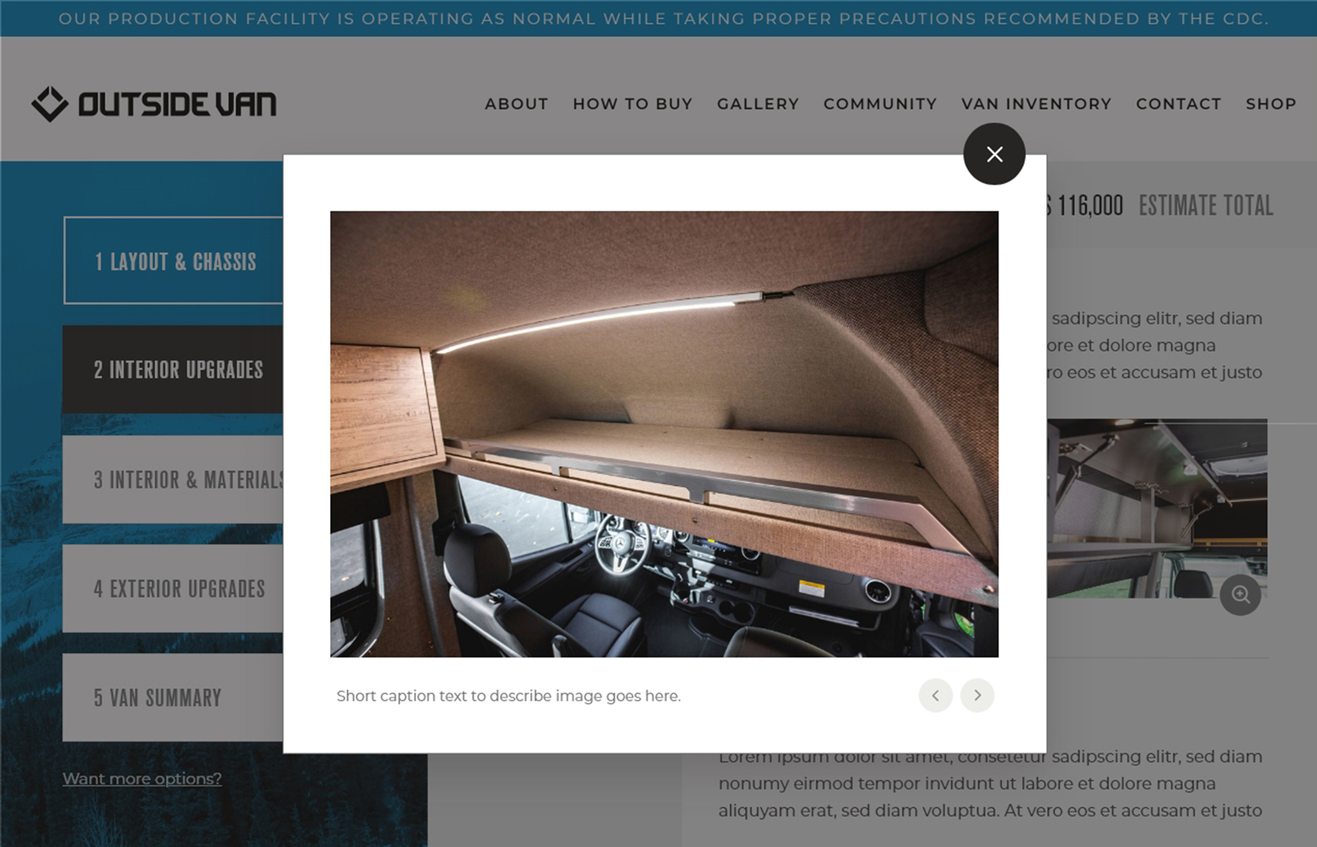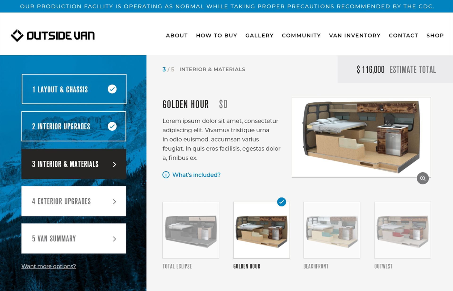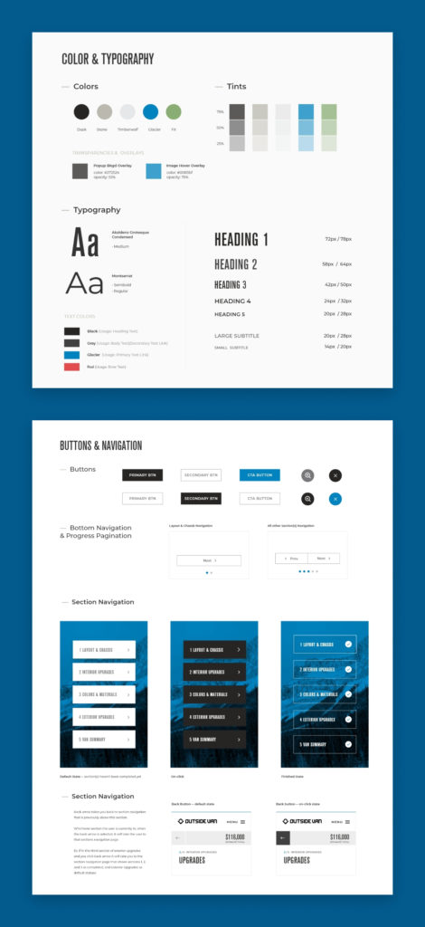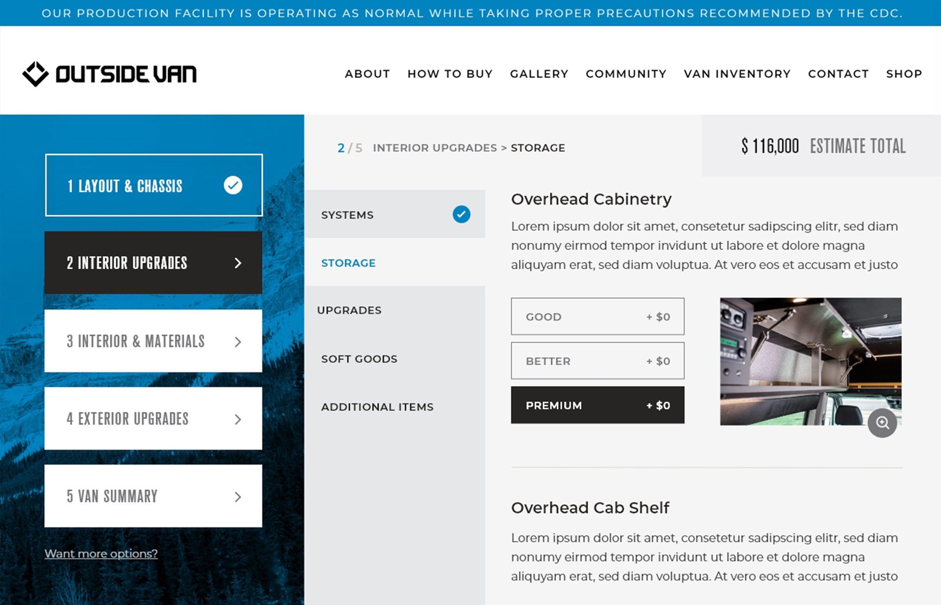 A complex solution finder was developed for new customers to determine what features and necessities they required before buying a van. This allowed a simple direct mechanism to cover all features and options provided by the Outside Van company starting a dialog with the customer. The Solution Finder style was developed to fit with the company’s pre-existing brand identity and web presence.